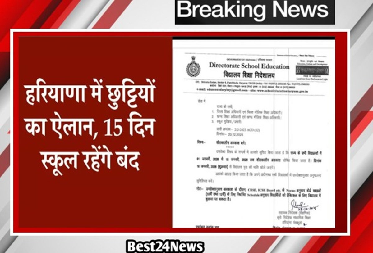 Haryana School Winter Vacation: शिक्षा विभाग का कहना है कि प्रदेश में लगातार बढ़ती ठंड और गिरते तापमान को देखते हुए बडा फैसला लिया गया है। हरियाणा सरकार ने प्रदेश के छात्रों और अभिभावकों को छुट्टियों जारी करके बड़ी राहत दी है। सभी सरकारी और मान्यता प्राप्त विद्यालयों में शीतकालीन अवकाश घोषित कर दिया है। छुट्टियों की सूचना मिलते ही बच्चों के चेहरे खिल उठे है।Haryana School Winter Vacation